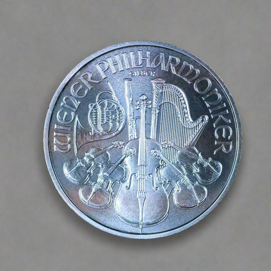 The Vienna Philharmonic (German: Wiener Philharmoniker), often shortened to Philharmonic, is a bullion coin of gold, silver, or platinum produced by the Austrian Mint (Münze Österreich). The coin is named for the Vienna Philharmonic orchestra, which inspired the design of both sides. It was introduced in 1989 as a one-troy ounce (ozt), gold coin with a face value of 2,000 Austrian schillings. It is generally one of the world's best selling bullion coins.[1][2] In 2002, with the adoption of the euro currency, the nominal value of the one-ounce coin was changed to 100 euros. In 2008, the Mint introduced a one-ounce silver version of the coin with a nominal value of 1.50 euros. The silver coin is also one of the top selling bullion coins, ranked third in 2013.[1] In 2016, the mint introduced a one ounce platinum coin with a face value of 100 euros. Wikipedia