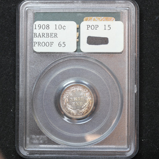 1908 Barber Dime 10c 90% Silver Proof - PCGS PR 65 - Old Green Label!