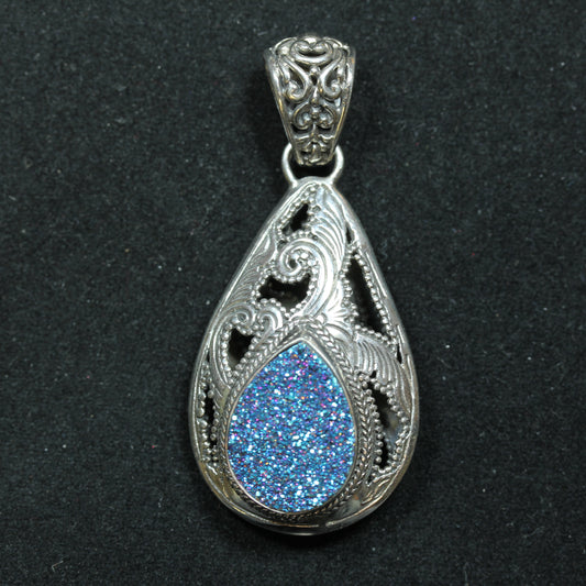 Sarda Sterling Silver Teardrop Filigree Style Druzy Quartz Charm Pendant ~2 inch