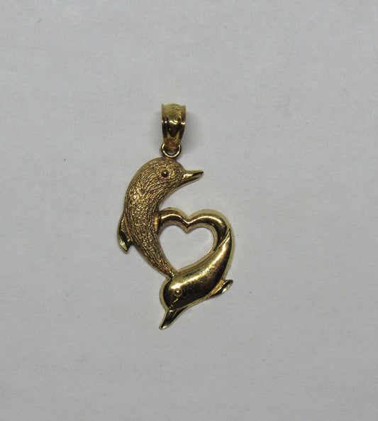 10k Yellow Gold Jumping Double Dolphin Heart Pendant