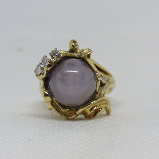 18K Yellow Gold Vintage Erwin Pearl Lavender Jade & Diamond Ring - Sz ~7.5