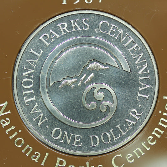 1987 New Zealand NZ $1 Coin National Parks Centennial BU in Perspex Case