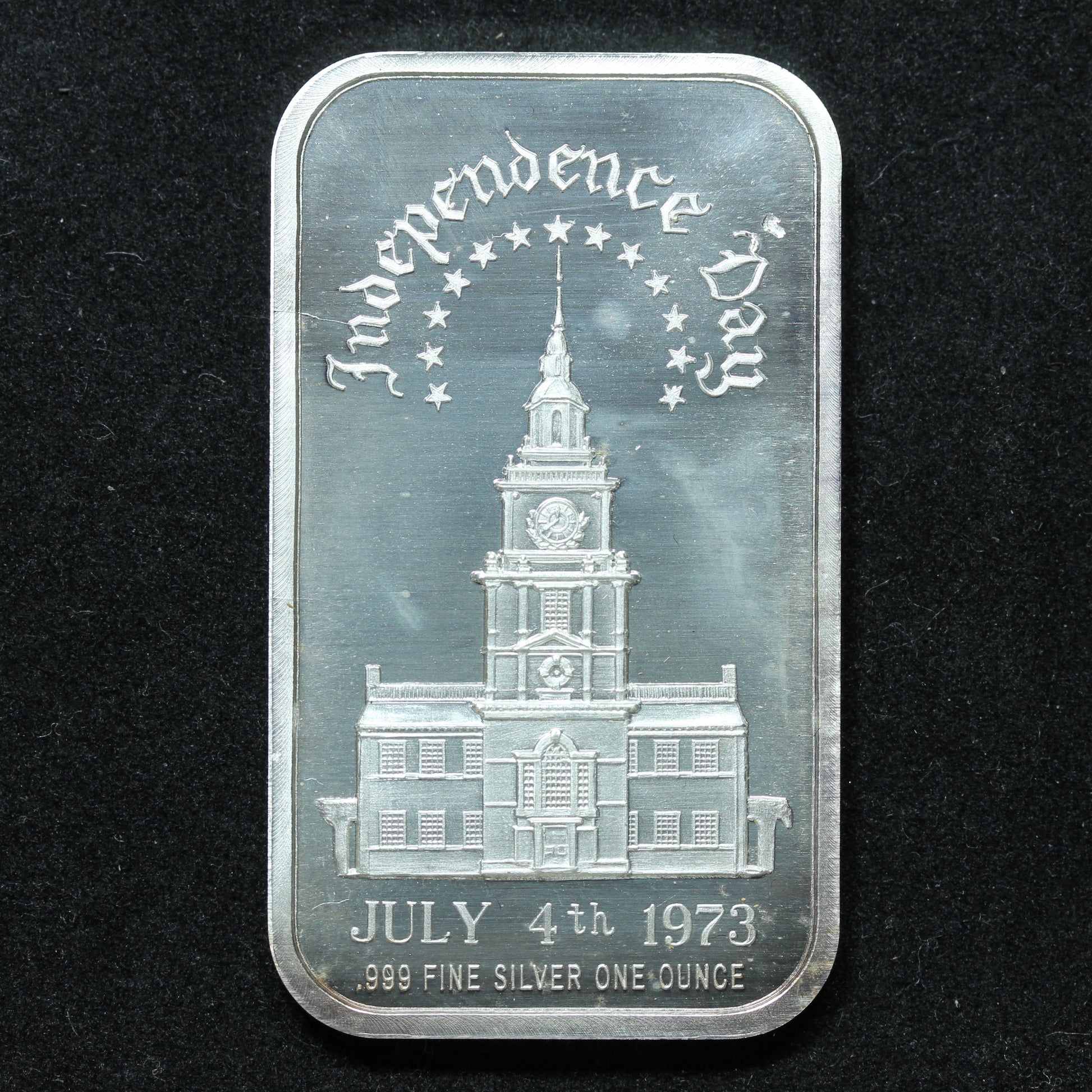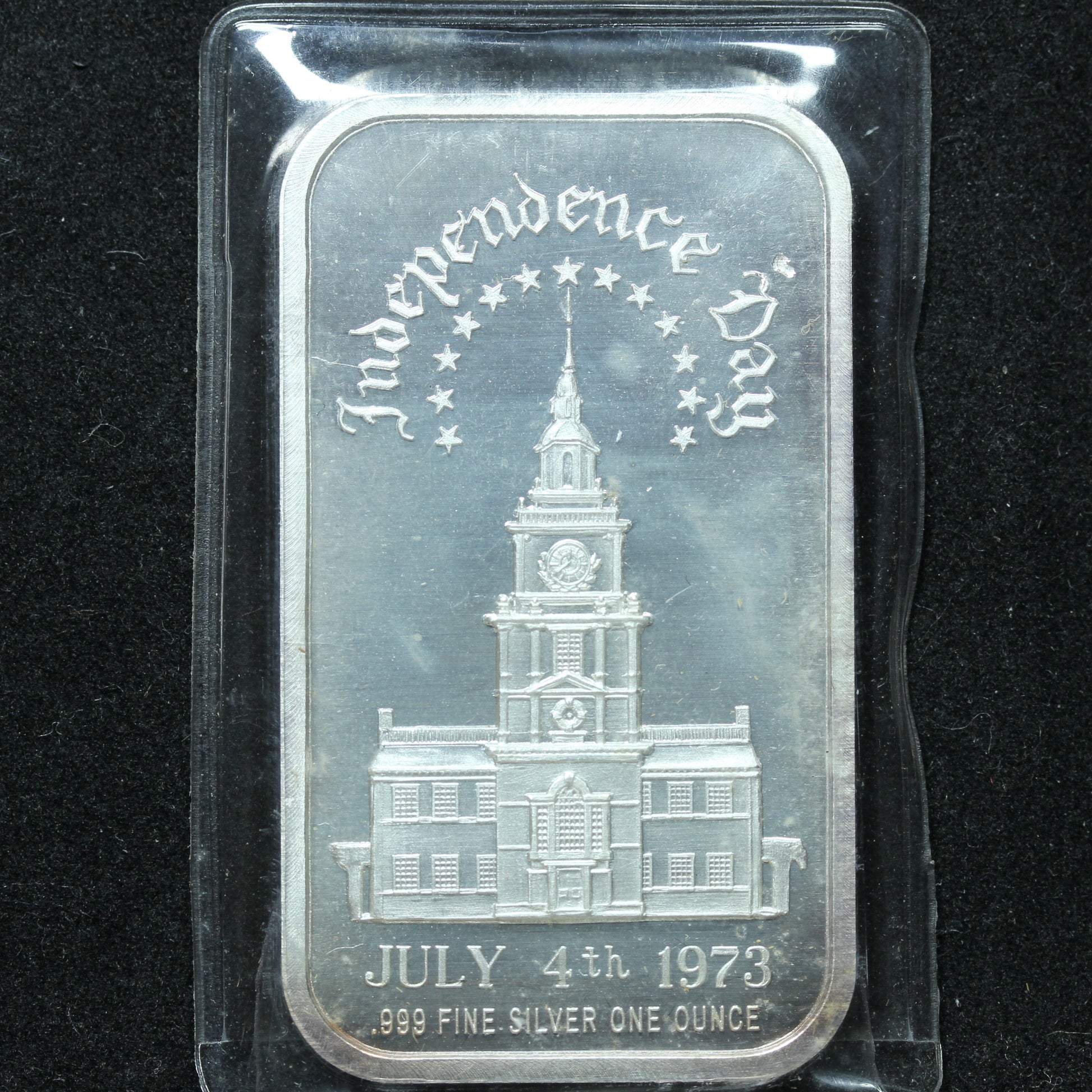 1 oz .999 Fine Silver Bar July 4, 1973 Independence Day / Independence Hall w/ Plastic