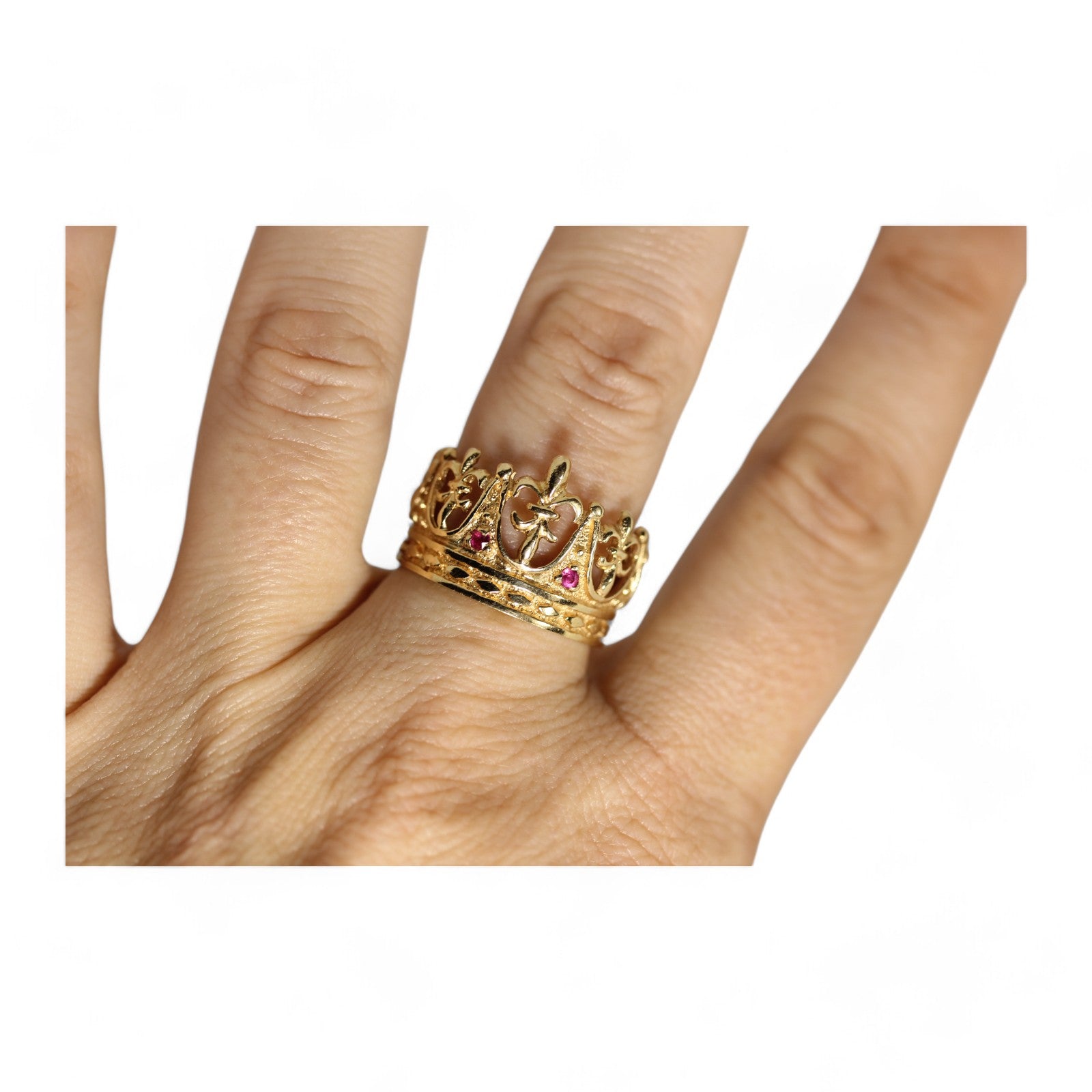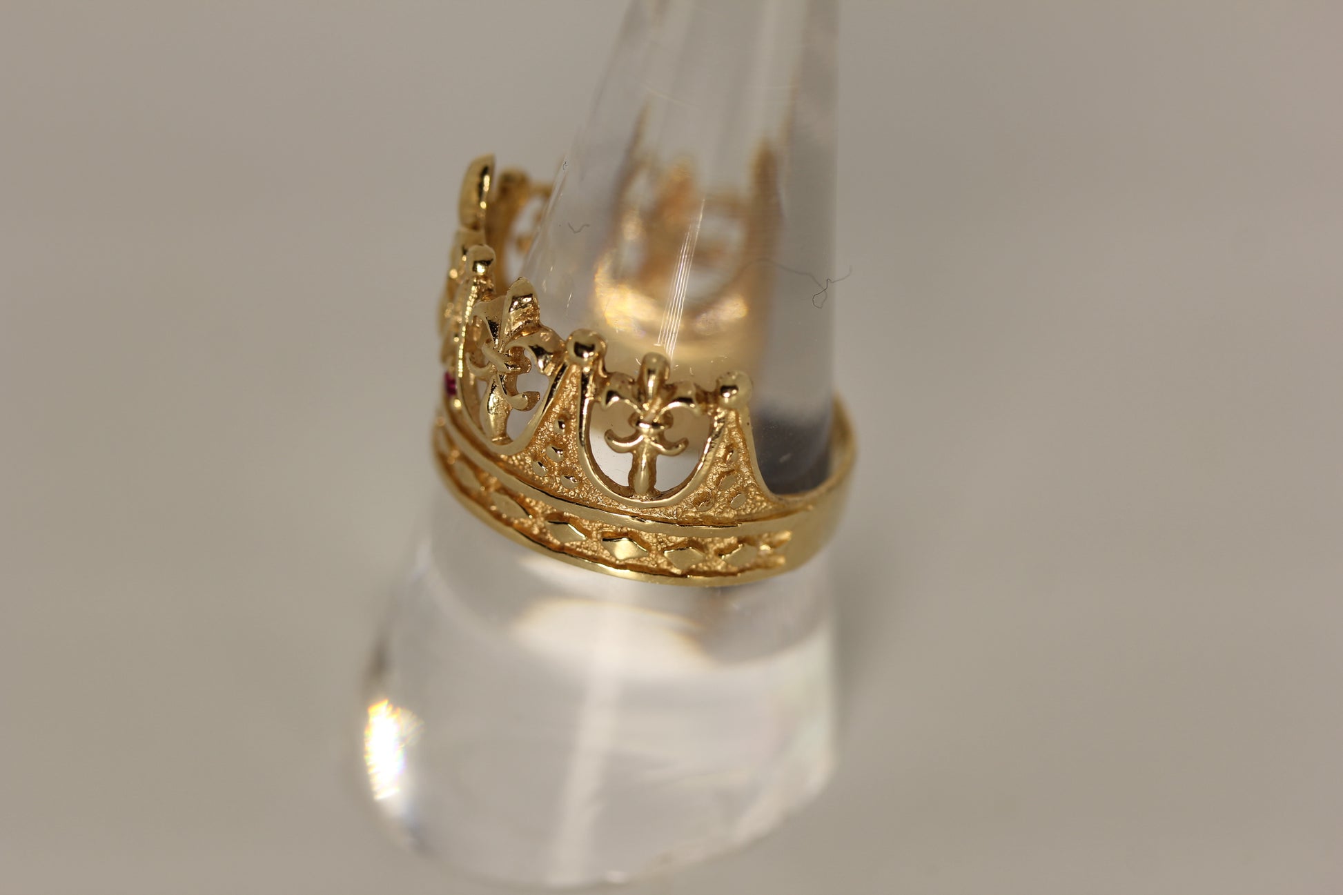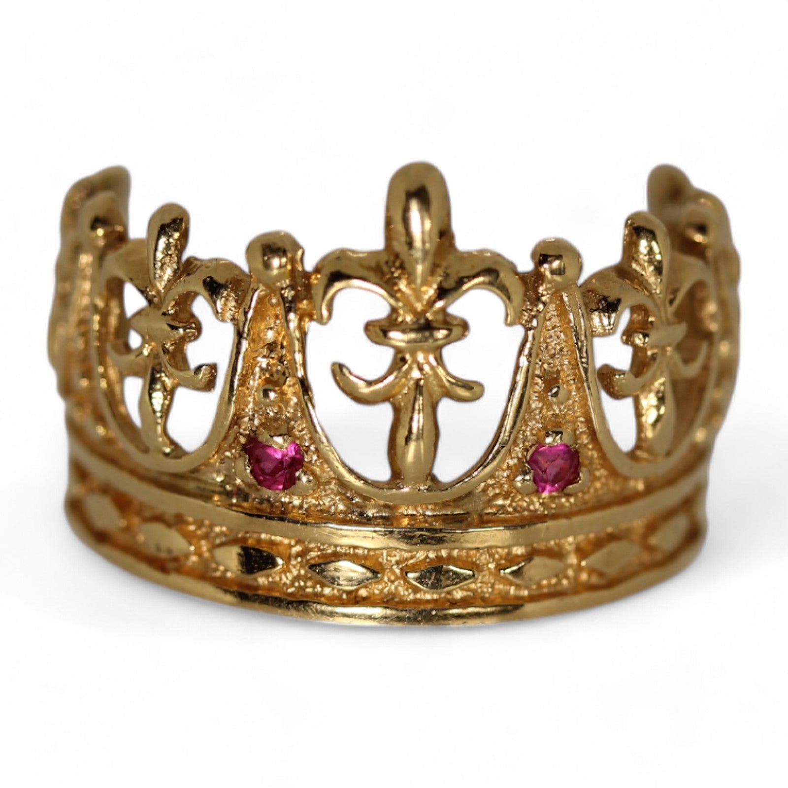 14k Yellow Gold Crown Ring with Fleur De Lis & Pink Stones - Sz 9