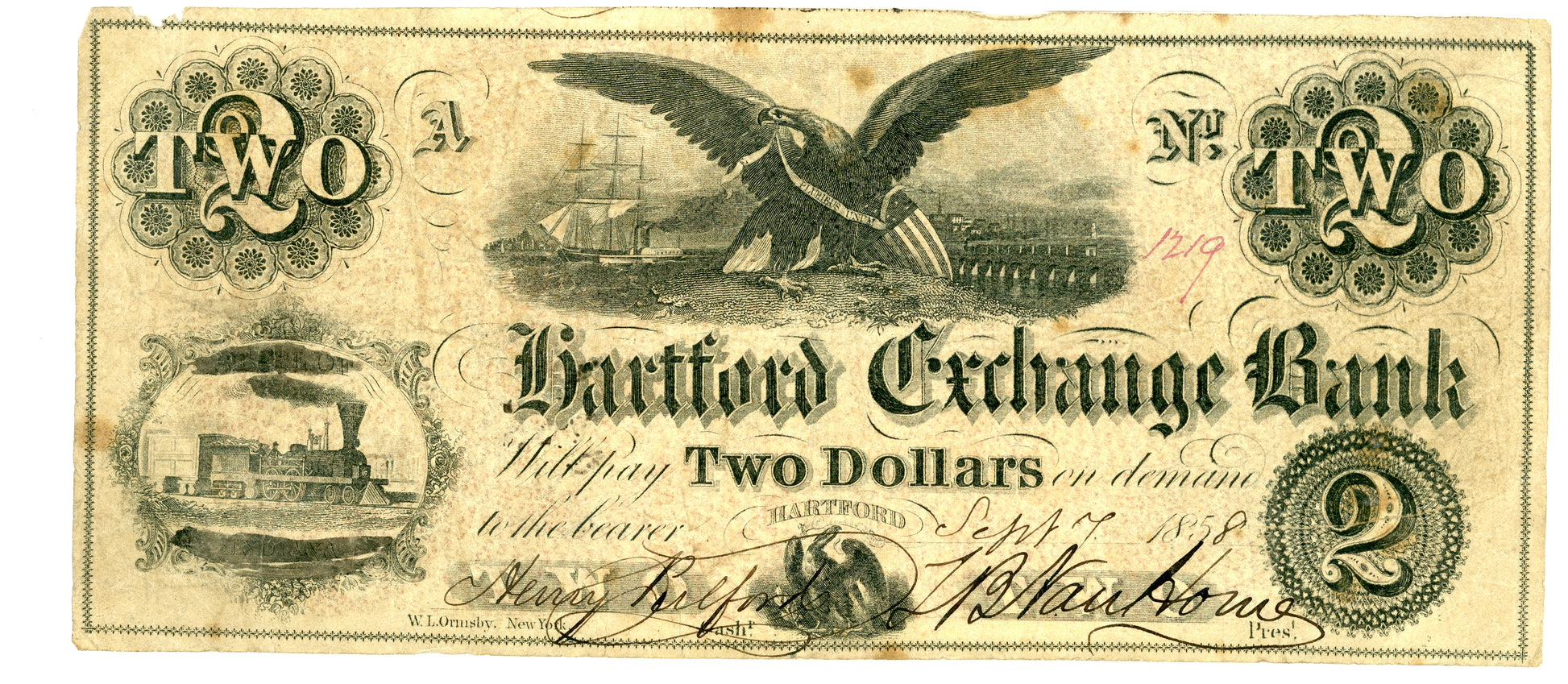 1858 $2 Hartford Indiana Exchange Bank Obsolete Currency 1219 9-17-1958