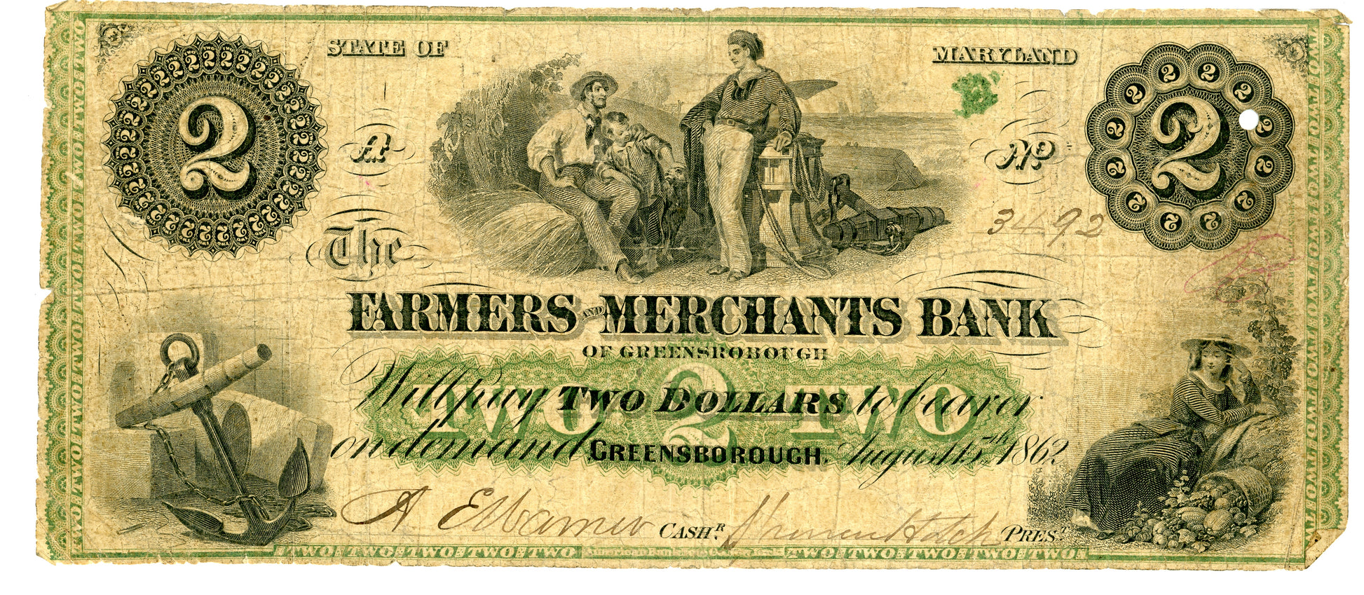 1862 $2 Farmers Merchants Bank Greensborough MD Obsolete Currency 3492