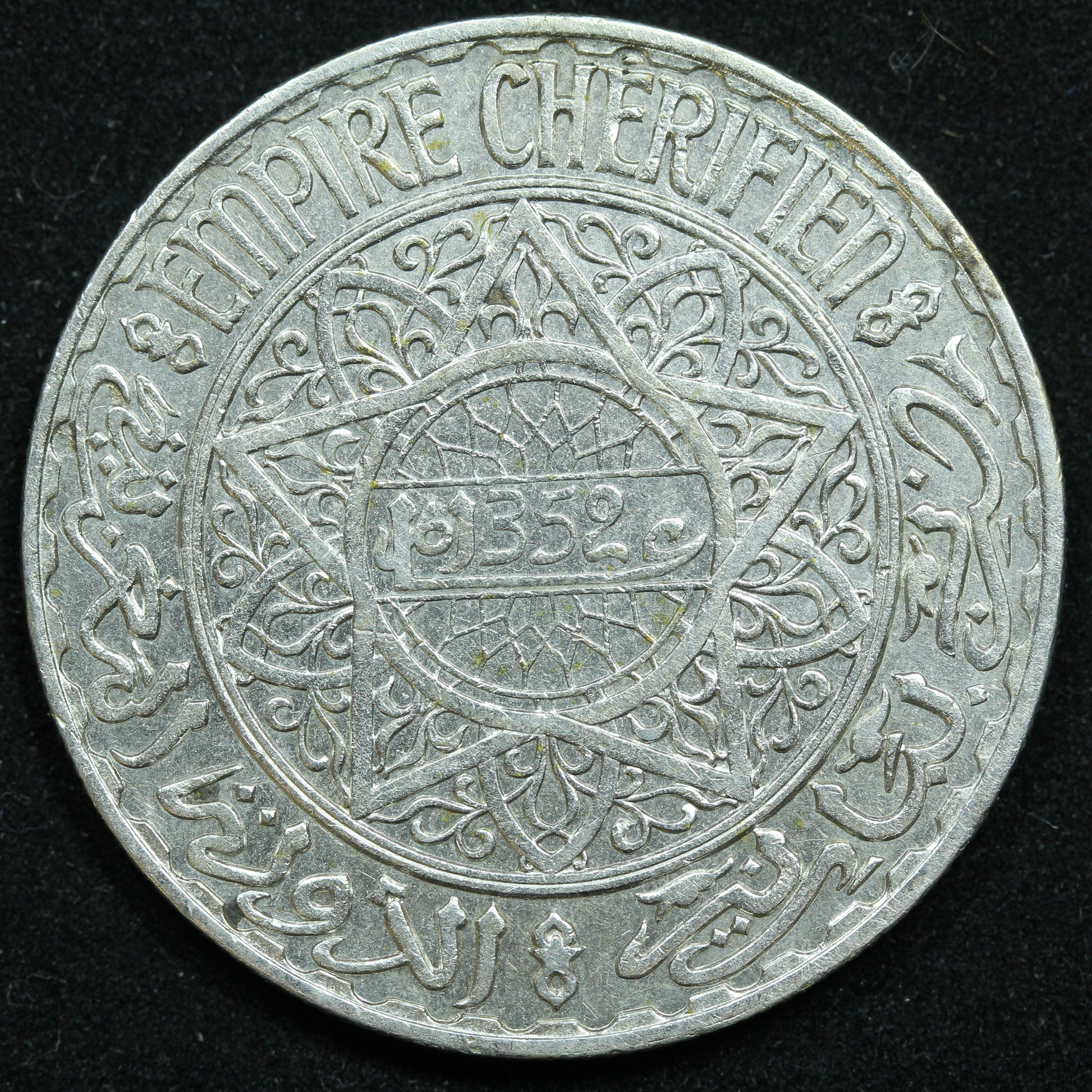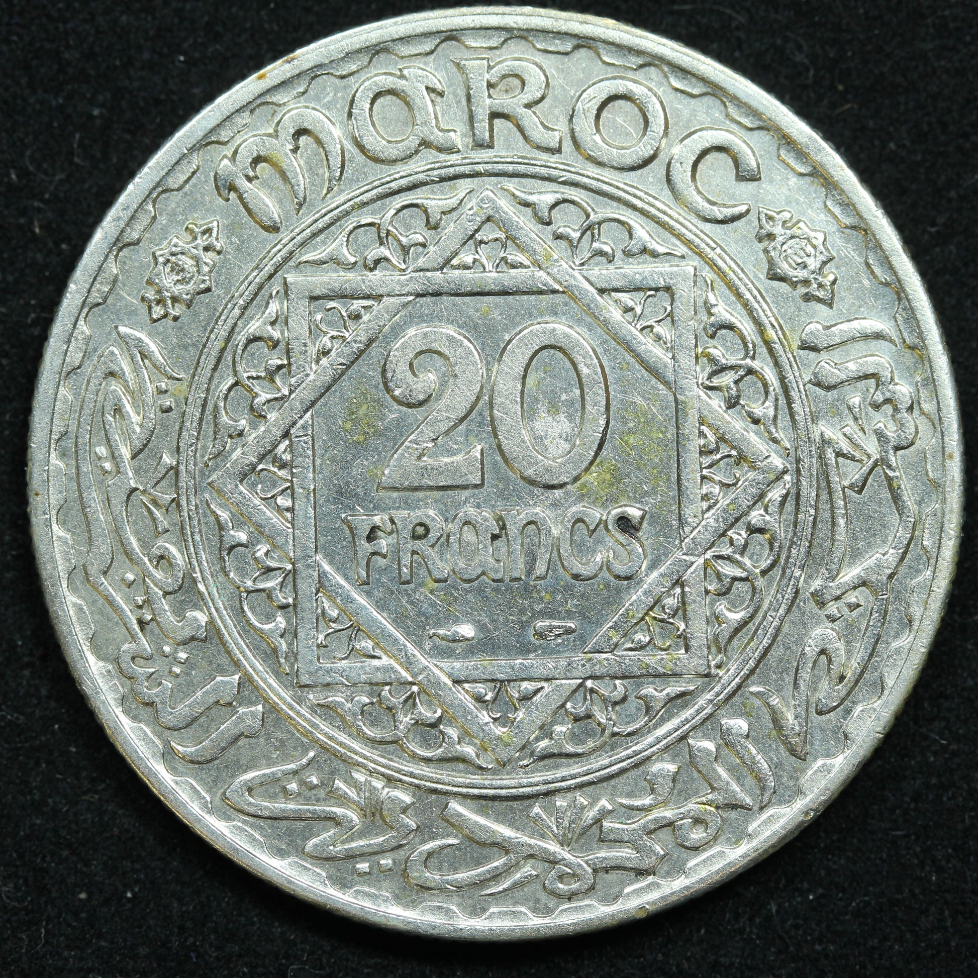 1933 (1352) Morocco 20 Francs Silver Coin - Y# 39