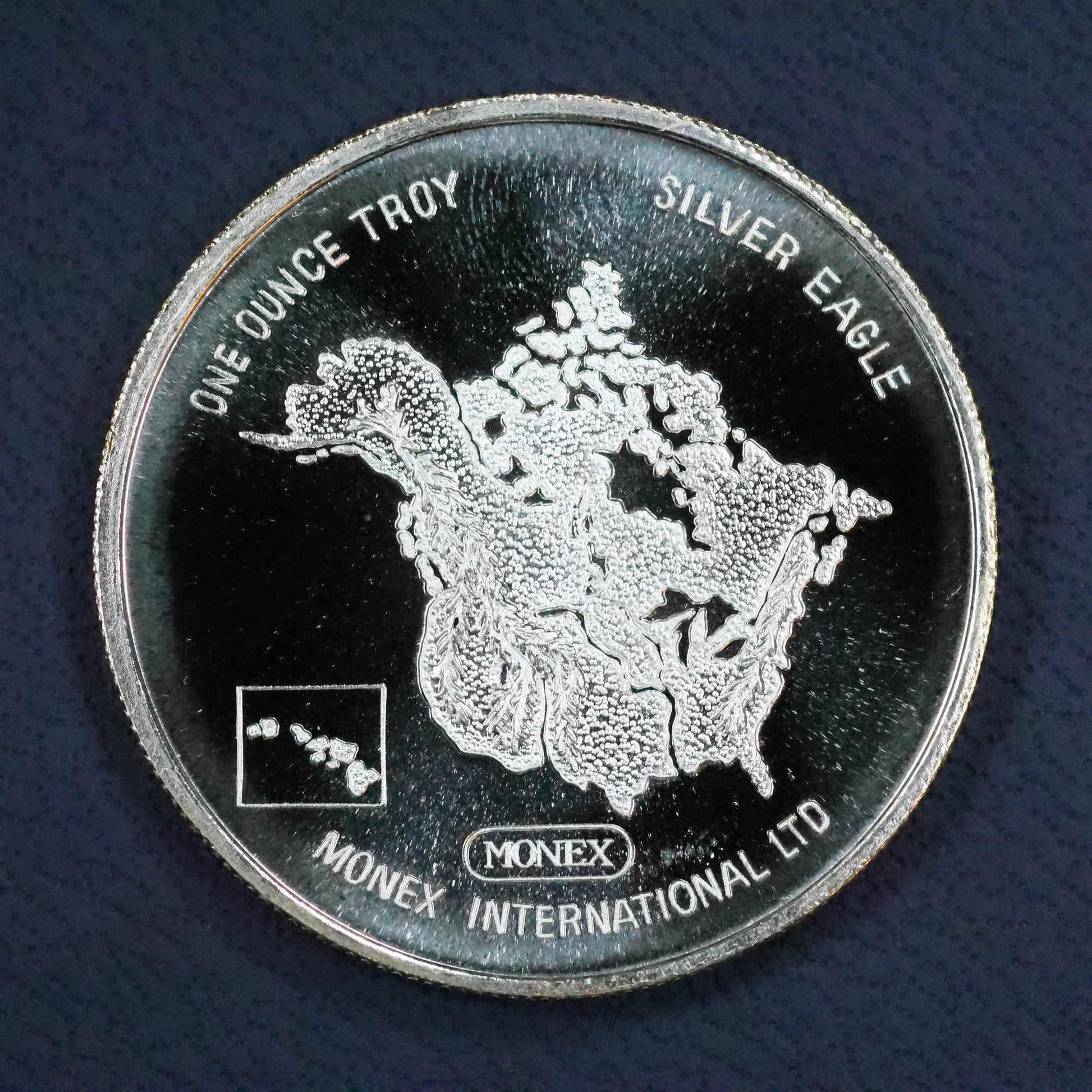 Monex International Mint Silver Eagle Design .999 Fine Silver Round. Coins are in very nice conditional - due to age they may have various stains of toning. Very pretty condition considering their age.