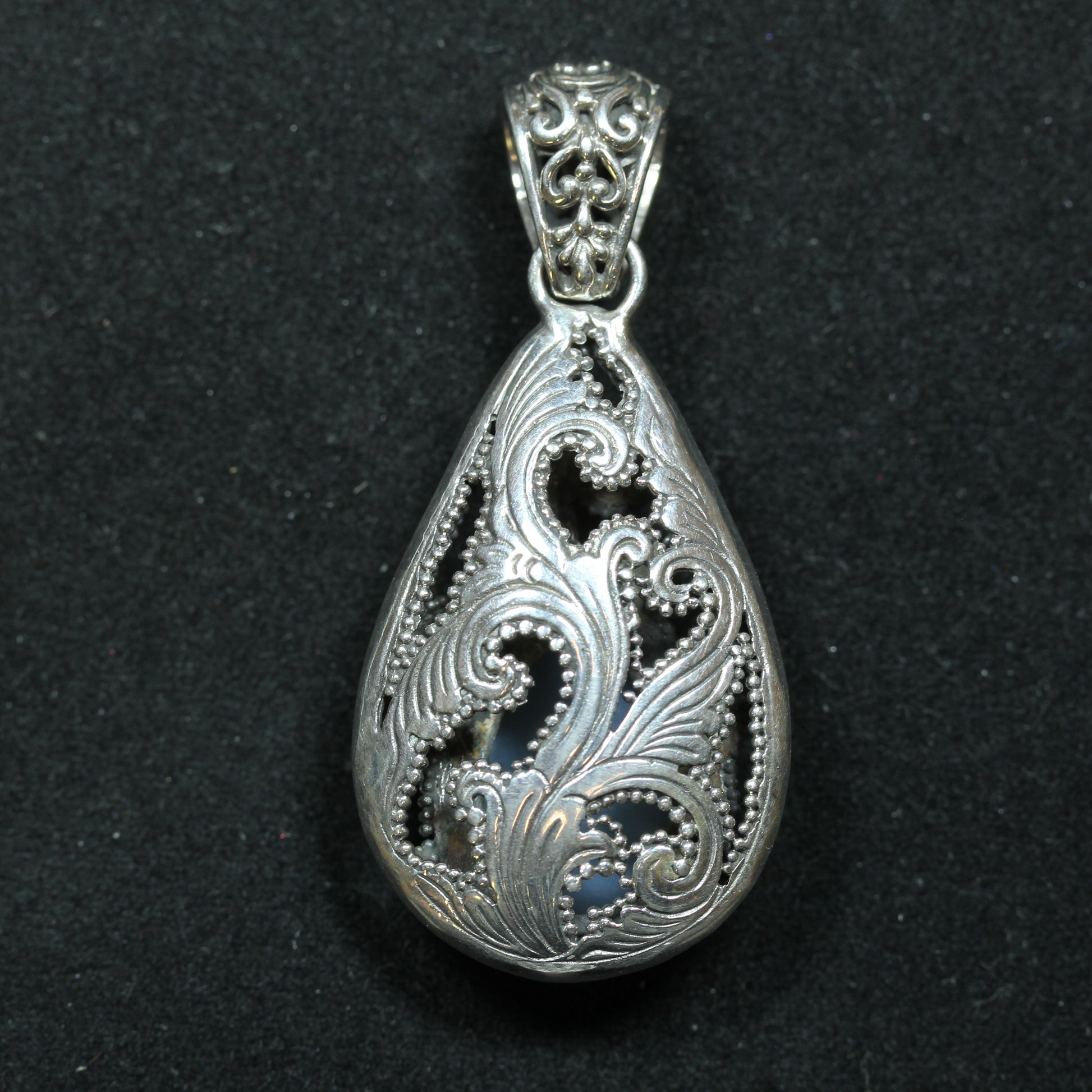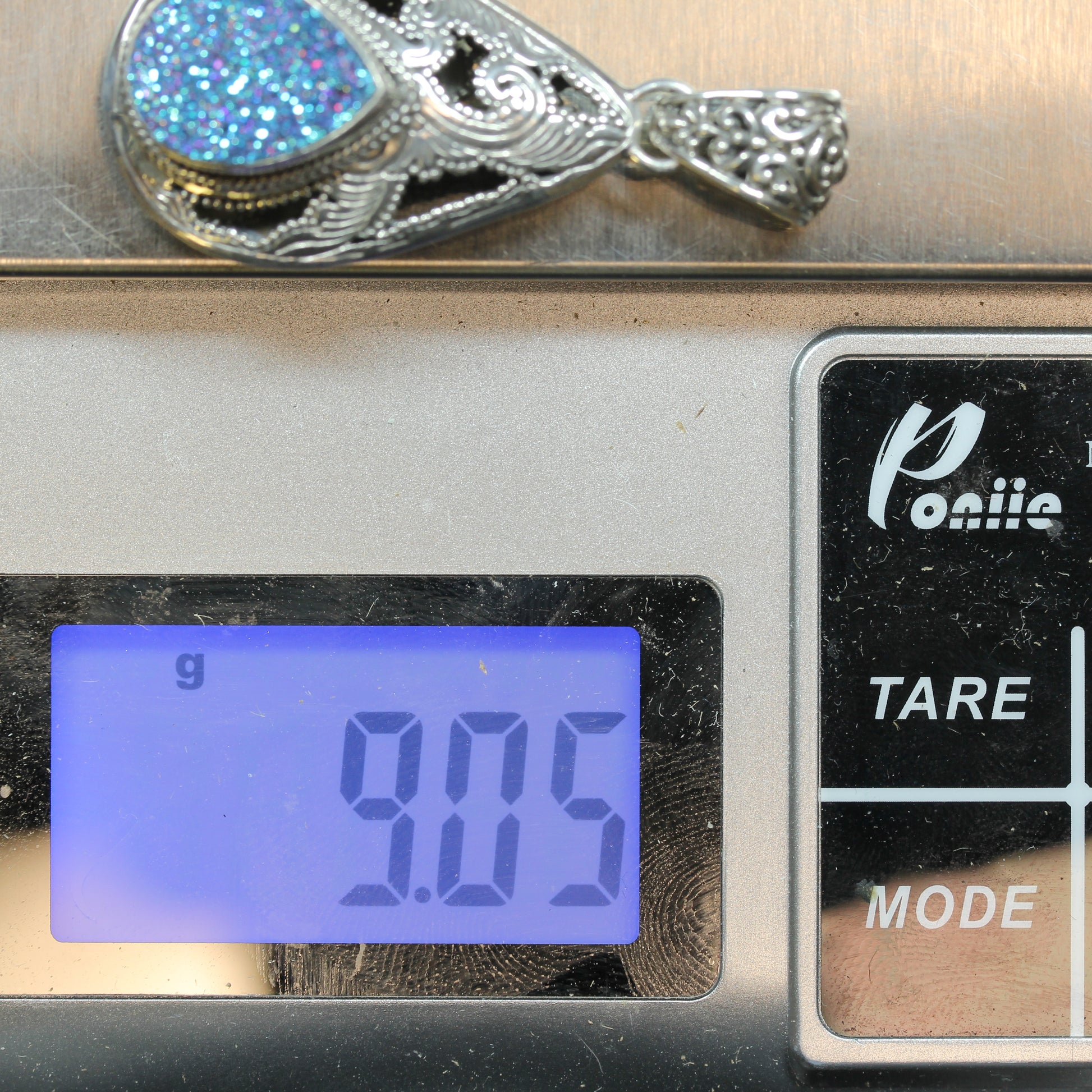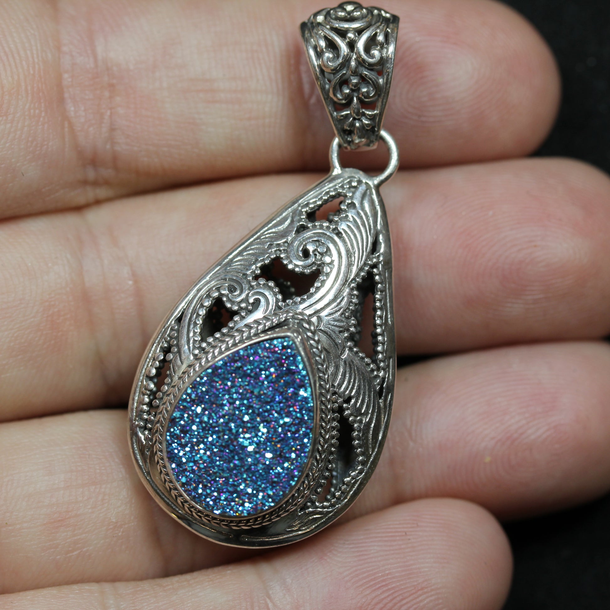 Sarda Sterling Silver Teardrop Filigree Style Druzy Quartz Charm Pendant ~2 inch
