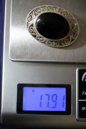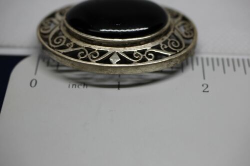 Sterling Silver Oval Black Onyx Cabochon Scroll Heart Diamond Pin Brooch